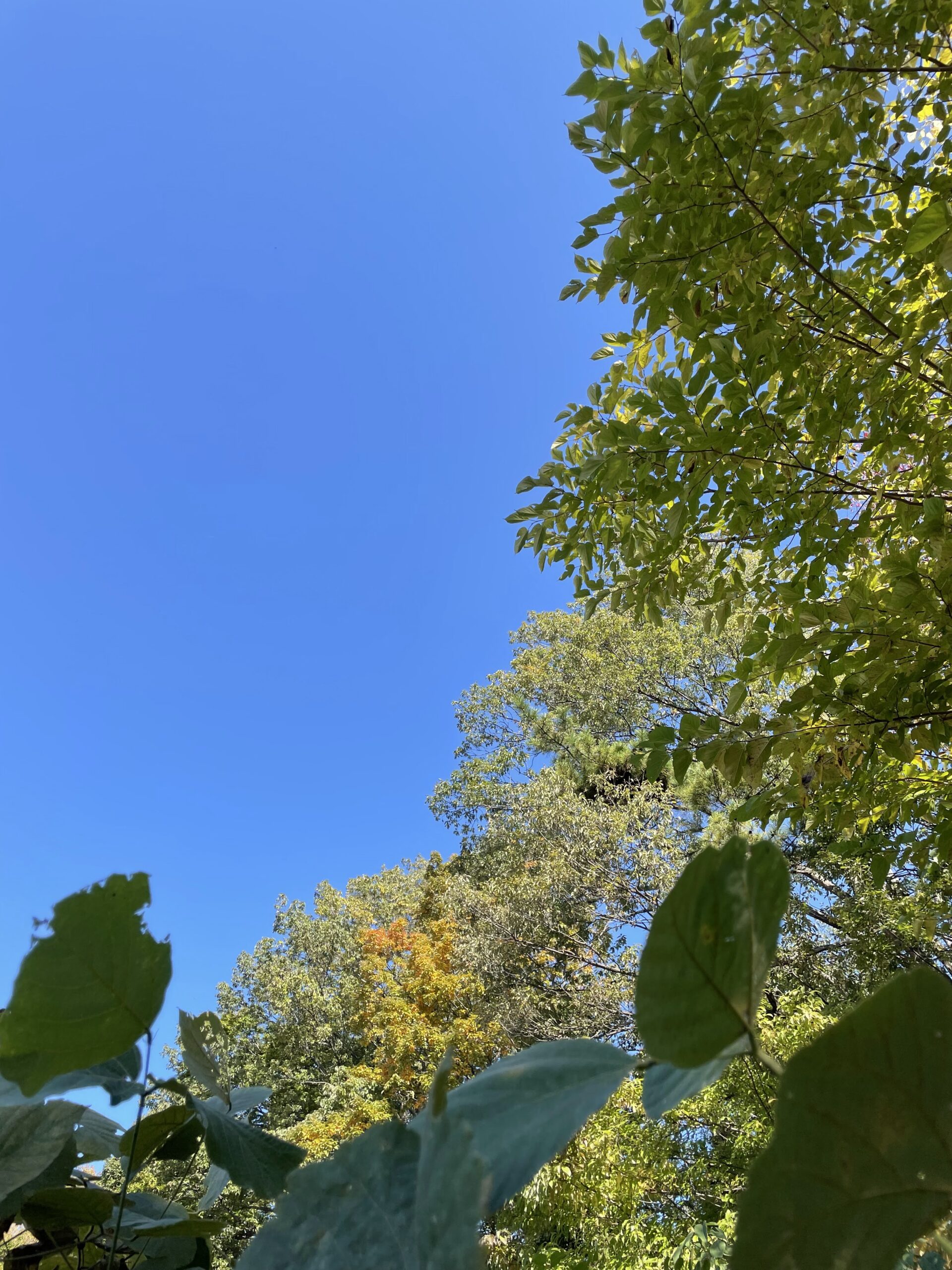 見上げてよく目を凝らすと、真っ青な空に突き出し色づき始めたコナラの枝間を素早く移動する小さく愛らしいメジロの家族達。