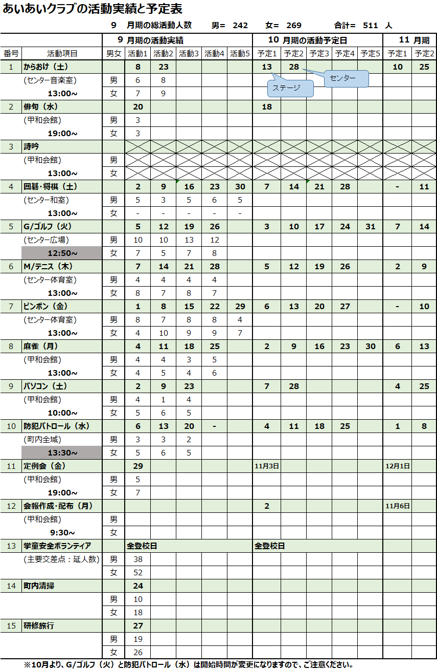 - 10月から、G/ゴルフと防犯パトロールの開始時間が変更になります。