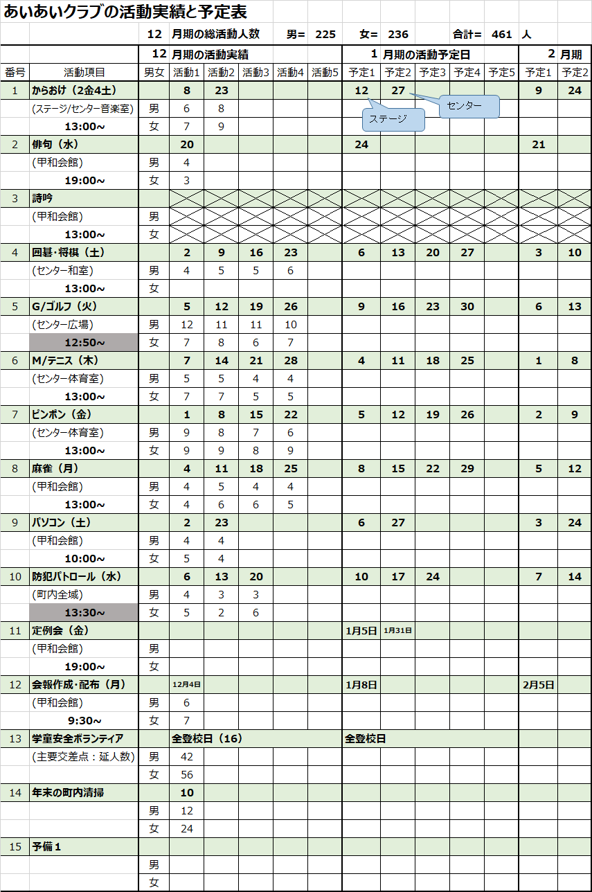 その中にあって、年間延べ活動参加人数5,500人を超える実績を誇り、八王子市で一番活発な当あいあいクラブが、生きるための基本であるところの合理的な体力の維持と頭脳明晰さの維持・鍛錬に少しでも手助けとなることを期待したいと思います。