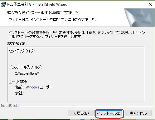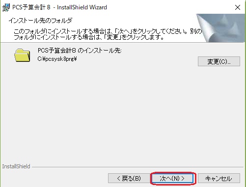 なお、途中にどこの場所にPCS予算会計8Mのプログラムをインストールするかを聞いてきますが、特に問題がなければ、例示したようにデフォルト(自動的に出てくる初期値通りの場所:この場合Cドライブのルート)で問題はないと思います。