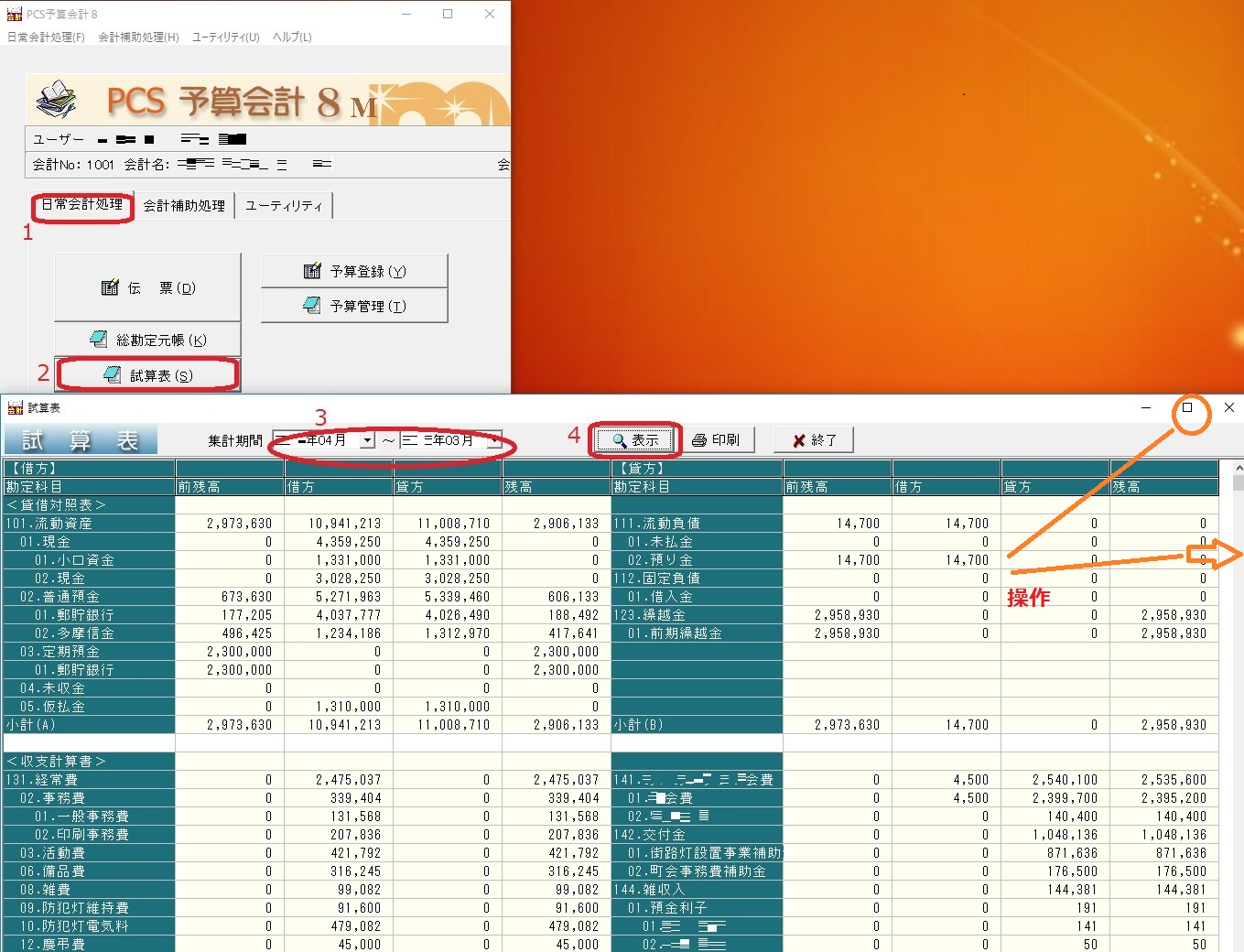 これで、試算表の窓が開きます。最初におそらく試算表全体のうち、最初の部分しか表示されていないと思いますので、横方向にマウスで広げてください。